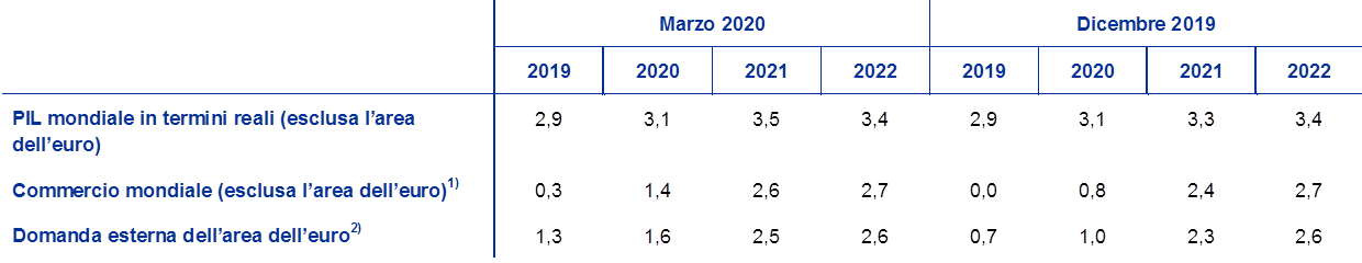 Le proiezioni relative al contesto internazionale sono state ultimate il 18 febbraio, prima della diffusione mondiale del COVID-19 oltre la Cina e della successiva reazione dei mercati finanziari. Questo riquadro descrive anzitutto le proiezioni incluse nello scenario di base, per poi esaminare gli andamenti più recenti successivi alla suddetta data di chiusura dell’esercizio e le possibili implicazioni degli stessi.