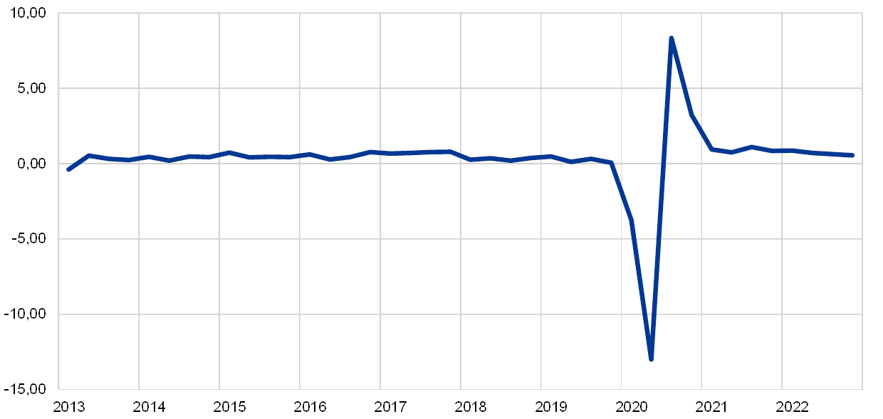Ο ρυθμός μεταβολής της μισθολογικής δαπάνης ανά απασχολούμενο αναμένεται, σύμφωνα με τις προβολές, να γίνει αρνητικός σε βραχυπρόθεσμο ορίζοντα, αλλά να ανακάμψει συμβαδίζοντας με την οικονομική δραστηριότητα το 2021 και να επιταχυνθεί σε μέτρια επίπεδα το 2022. Η μισθολογική δαπάνη ανά μισθωτό αναμένεται να μειωθεί έντονα το β΄ τρίμηνο του 2020. Αυτό αντανακλά τη μεγάλου μεγέθους και απότομη πτώση των πραγματικών ωρών εργασίας ανά απασχολούμενο που σημειώθηκε στη διάρκεια των μέτρων καραντίνας και τη μερική μόνο αντιστάθμιση της μείωσης της μισθολογικής δαπάνης από τα σχήματα μειωμένου χρόνου εργασίας. Ωστόσο, οι εξελίξεις στη μισθολογική δαπάνη ανά απασχολούμενο δίνουν μια υπερβολική εικόνα της μείωσης του εισοδήματος από εργασία, καθώς ορισμένες χώρες δεν καταγράφουν στατιστικά την κρατική στήριξη στην κατηγορία «μισθολογική δαπάνη» αλλά στην κατηγορία «μεταβιβάσεις». Στη συνέχεια, δεδομένης της ανάκαμψης της οικονομικής δραστηριότητας και των πραγματικών ωρών εργασίας ανά απασχολούμενο, η μισθολογική δαπάνη ανά απασχολούμενο αναμένεται να ανακάμψει και να αυξηθεί σταδιακά περαιτέρω στη διάρκεια του χρονικού ορίζοντα προβολής. Σε ό,τι αφορά τους ετήσιους ρυθμούς μεταβολής, αυτές οι εξελίξεις συνεπάγονται μια απότομη πτώση του ρυθμού μεταβολής της μισθολογικής δαπάνης ανά απασχολούμενο το 2020 από -1,9%, μια ανάκαμψη σε 3,2% το 2021 και πιο συγκρατημένη άνοδο της μισθολογικής δαπάνης ανά απασχολούμενο κατά 1,9% το 2022.