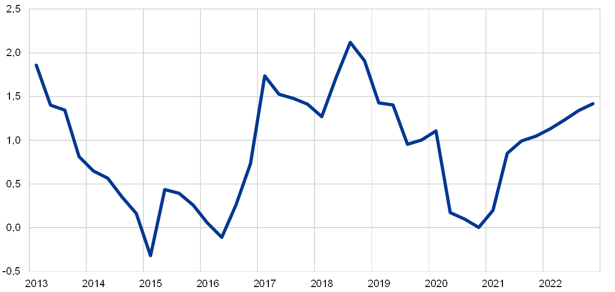 Ο πληθωρισμός (βάσει του ΕνΔΤΚ) αναμένεται να μειωθεί από 1,2% το 2019 σε 0,3% το 2020 και στη συνέχεια να αυξηθεί σε 0,8% και 1,3% το 2021 και το 2022 αντιστοίχως (βλ. Διάγραμμα 2). Ο βραδύτερος ρυθμός του μετρούμενου πληθωρισμού το 2020 αντανακλά, ιδίως, μια απότομη μείωση των τιμών της ενέργειας στον ΕνΔΤΚ, δεδομένης της πτώσης των τιμών του πετρελαίου μετά την εξάπλωση της νόσου COVID-19 παγκοσμίως. Ο πληθωρισμός (βάσει του ΕνΔΤΚ) των τιμών της ενέργειας αναμένεται να έχει μεγάλη αρνητική συμβολή 0,8 της ποσοστιαίας μονάδας στον μετρούμενο πληθωρισμό το 2020. Οι αυξήσεις των τιμών του πετρελαίου, όπως δείχνει η θετική κλίση της καμπύλης των τιμών των συμβολαίων μελλοντικής εκπλήρωσης επί του πετρελαίου και ορισμένες ανοδικές επιδράσεις από την ενέργεια που σχετίζονται με τις αυξήσεις των έμμεσων φόρων, υποδηλώνουν αύξηση του πληθωρισμού (βάσει του ΕνΔΤΚ) των τιμών της ενέργειας στην υπόλοιπη διάρκεια του χρονικού ορίζοντα προβολής. Ο πληθωρισμός (βάσει του ΕνΔΤΚ) των ειδών διατροφής πρόσφατα αυξήθηκε, καθώς σημειώθηκε άνοδος της ζήτησης επεξεργασμένων και μη επεξεργασμένων ειδών διατροφής εκ μέρους των νοικοκυριών στο πλαίσιο των περιοριστικών μέτρων λόγω COVID-19 και καθώς εκδηλώθηκαν ορισμένες διαταράξεις στην αλυσίδα εφοδιασμού νωπών ειδών διατροφής. Ο πληθωρισμός των ειδών διατροφής αναμένεται να παραμείνει αυξημένος σε βραχυπρόθεσμο ορίζοντα, αλλά να μειωθεί στη διάρκεια του έτους και να καταγράψει χαμηλότερους ρυθμούς το 2021 και το 2022 σε σχέση με το 2020.