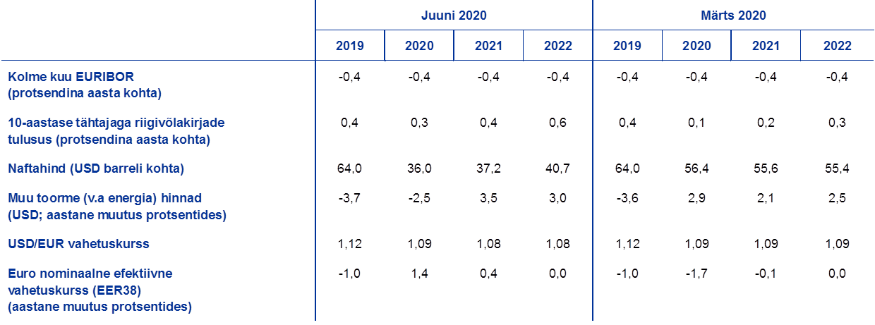2020. aasta märtsis avaldatud ettevaatega võrreldes hõlmavad tehnilised eeldused märkimisväärselt madalamaid nafta- ja aktsiahindu, euro efektiivse vahetuskursi tõusu ning kõrgemaid pikaajalisi intressimäärasid. Tehnilised eeldused intressimäärade ja toormehindade kohta põhinevad turgude ootustel seisuga 18. mai 2020. Lühiajalisi intressimäärasid mõõdetakse kolme kuu EURIBORina ja turgude ootused tuletatakse futuurilepingute intressimääradest. Selle meetodi kohaselt on lühiajaliste intressimäärade keskmine tase kogu ettevaateperioodil –0,4%. Turgude ootuste järgi peaks euroala riikide kümneaastase tähtajaga võlakirjade nominaalne intressimäär olema 2020. aastal keskmiselt 0,3%, 2021. aastal 0,4% ning 2022. aastal 0,6%.[4] 2020. aasta märtsis avaldatud ettevaatega võrreldes püsivad turgude ootused lühiajaliste intressimäärade arengu suhtes üldiselt muutumatuna ning euroala riikide kümneaastase tähtajaga võlakirjade nominaalseid intressimäärasid on korrigeeritud aastateks 2020–2022 ligikaudu 20 baaspunkti võrra ülespoole.