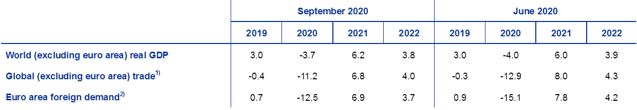 Global real GDP (excluding the euro area), after contracting by 3.7% in 2020, is projected to rebound and grow at 6.2% in 2021 and 3.8% in 2022. The recovery in the level of activity, however, is incomplete. Some forms of social distancing are assumed to remain in place and a medical solution is expected only by mid-2021. The global baseline assumes some continuation of the rise in infections which, however, are more localised than in the first wave and dealt with by more targeted containment measures. The latter, thanks to learning from past experience, are less disruptive for economic activity than before. The lingering uncertainty about the evolution of the pandemic and its economic fallout will weigh on consumer sentiment. Compared with the June 2020 Eurosystem staff projections, global real GDP growth (excluding the euro area) has been revised marginally upwards for 2020 and 2021 and is largely unrevised for 2022.