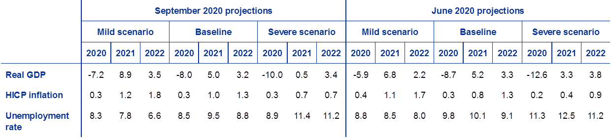 Note: Real GDP and components, unit labour costs, compensation per employee and labour productivity refer to seasonally and working day-adjusted data. This table does not show ranges around the projections. This reflects the fact that the standard computation of the ranges (based on historical projection errors) would not, in the present circumstances, provide a reliable indication of the unprecedented uncertainty surrounding the current projections. Instead, in order to better illustrate the current uncertainty, alternative scenarios based on different assumptions regarding the future evolution of the COVID-19 pandemic and the associated containment measures are provided in Box 3.