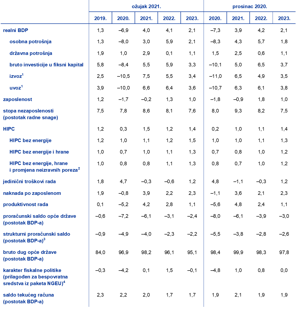 Napomene: Realni BDP i njegove sastavnice, jedinični troškovi rada, naknada po zaposlenom i produktivnost rada odnose se na sezonski i kalendarski prilagođene podatke. Podatci se mogu razlikovati od najnovijih Eurostatovih podataka ako su ti podatci objavljeni poslije krajnjeg datuma projekcija. U tablici nisu prikazani rasponi oko projekcija zbog toga što uobičajeni izračun raspona (zasnovan na pogreškama iz prošlih projekcija) u sadašnjim okolnostima ne bi bio pouzdan pokazatelj dosad nezabilježene neizvjesnosti povezane s ovim projekcijama. Umjesto toga radi bolje ilustracije trenutačne neizvjesnosti u odjeljku 5. predstavljeni su alternativni scenariji utemeljeni na različitim pretpostavkama o budućem tijeku pandemije bolesti COVID‑19 i povezanim mjerama za sprječavanje njezina širenja.
