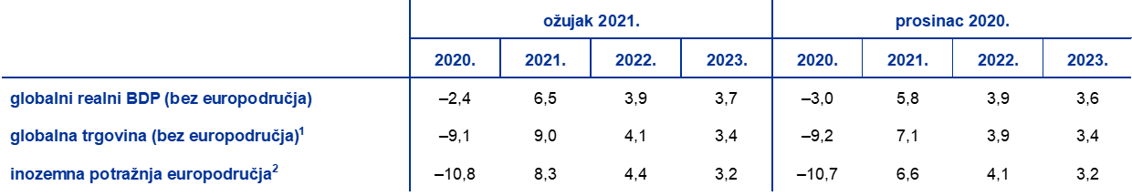 Nakon recesije izazvane pandemijom globalna gospodarska aktivnost u drugoj je polovici 2020. rasla brže nego što se to prethodno očekivalo. Globalna ulaganja – potaknuta povoljnim uvjetima financiranja koje snažno podupire monetarna politika – već su blizu razinama zabilježenima prije pandemije, dok oporavak globalne potrošnje – poduprt fiskalnim mjerama za potporu prihodima i očuvanje radnih mjesta – i dalje zaostaje jer mjere za sprječavanje širenja zaraze nepovoljno utječu na usluge koje se zasnivaju na međuljudskim kontaktima. Rast globalnog realnog BDP‑a (bez europodručja) snažno je porastao, za 7,4 %, u trećem tromjesečju 2020., što je za 0,7 postotnih bodova više nego što se očekivalo u projekcijama iz prosinca 2020. Snažnija dinamika oporavka zabilježena je i u razvijenim zemljama i u zemljama s tržištem u nastajanju. Oporavak globalne gospodarske aktivnosti trebao bi se, poslije opisanog kretanja u obliku slova V, u četvrtom tromjesečju 2020. nastaviti snažnom, ali umjerenijom dinamikom po stopi od 2,1 %, što je više nego što je bilo predviđeno u prethodnim projekcijama.