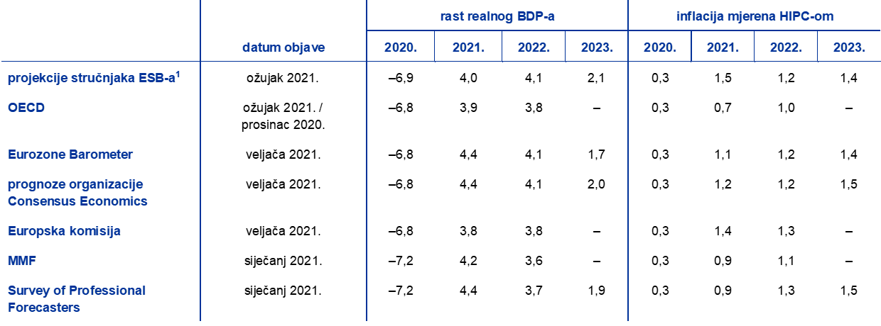 Izvori: MJEconomics for the Euro Zone Barometer, 18. veljače 2021., podatci za 2023. uzeti su iz ankete iz siječnja 2021.; prognoze organizacije Consensus Economics, 11. veljače 2020., podatci za 2023. uzeti su iz ankete iz siječnja 2021.; zimske (privremene) gospodarske prognoze Europske komisije iz 2021.; istraživanje ESB‑a Survey of Professional Forecasters za prvo tromjesečje 2021. provedeno u razdoblju od 7. do 11. siječnja 2021.; OECD Interim Economic Outlook Report, ožujak 2021., za rast realnog BDP‑a; OECD Economic Outlook br. 108, prosinac 2020., za inflaciju mjerenu HIPC‑om; IMF World Economic Outlook, 26. siječnja 2021.