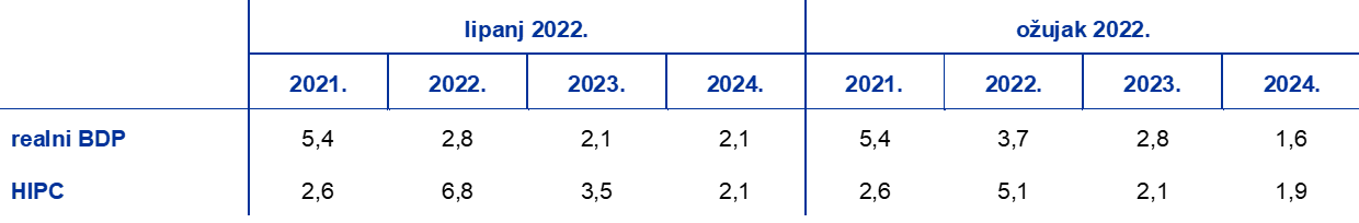 U odnosu na projekcije iz ožujka 2022. rast realnog BDP‑a revidiran je naniže za 0,9 postotnih bodova za 2022. te za 0,7 postotnih bodova za 2023. Za 2024. revidiran je naviše za 0,5 postotnih bodova. Smanjeni izgledi za 2022. uglavnom su posljedica nepovoljnog utjecaja rata u Ukrajini na cijene energije i hrane, povjerenje i trgovinu. Revizija naniže rasta BDP‑a za 2023. proizlazi iz negativnog prijenosa učinaka iz 2022., dok revizija naviše za 2024. proizlazi iz ponovnog jačanja aktivnosti kako utjecaj nepovoljnih čimbenika bude slabio.
