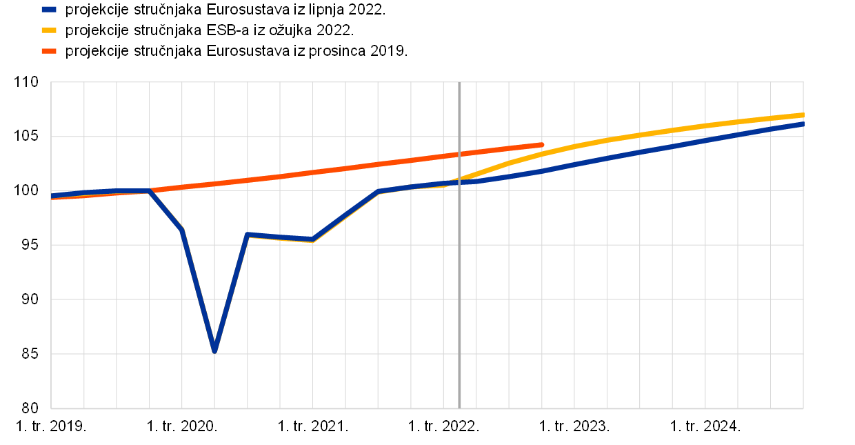 Očekuje se da će nakon kratkoročnog razdoblja rast postupno jačati kako utjecaj nepovoljnih čimbenika bude slabio, premda će razina BDP‑a tijekom cijelog projekcijskog razdoblja ostati osjetno niža nego što je predviđeno u prethodnim projekcijama. Očekivano poboljšanje proizlazi iz pretpostavki da će se intenzivna faza rata u Ukrajini završiti do kraja 2022., da će učinak pandemije na gospodarstvo i dalje slabjeti, da će se obrasci potrošnje normalizirati, da će se problem uskih grla u opskrbnim lancima riješiti do kraja 2023. te da rastu izvoza pridonosi veća cjenovna konkurentnost u odnosu prema ključnim trgovinskim partnerima, npr. SAD‑u, i oporavak inozemne potražnje. Očekuje se da će viša inflacija, čijem rastu pridonose i učinci rata u Ukrajini na cijene sirovina, dovesti do smanjenja realnog raspoloživog dohotka i smanjiti realnu vrijednost velike štednje nastale tijekom pandemije te time smanjiti potrošnju u kratkoročnom razdoblju. U srednjoročnom bi razdoblju smanjenje stopa inflacije trebalo postupno omogućiti ponovni rast realnog dohotka i pridonijeti potrošnji. Trebali bi oslabjeti i negativni učinci manjeg povjerenja i povećane neizvjesnosti, koji potiču štednju iz opreza u kratkoročnom razdoblju. Nakon znatne potpore vlada gospodarskoj aktivnosti tijekom krize prouzročene pandemijom bolesti COVID‑19 u 2020. i 2021. te većeg očekivanog ulaganja u 2022. financiranog programom Next Generation EU (NGEU) kao i nedavnih potpora povezanih s visokim cijenama energije i ratom u Ukrajini očekuje se da će fiskalna politika u 2023. negativno utjecati na rast jer će neke od tih mjera prestati. Predviđa se da će fiskalna pozicija sve do kraja projekcijskog razdoblja biti blaža u odnosu na razdoblje prije izbijanja pandemije, što će imati pozitivan učinak na razinu BDP‑a. Općenito gledajući, s obzirom na reviziju naniže kratkoročnih izgleda i očekivani tek djelomični oporavak u srednjoročnom razdoblju, predviđa se da će razina realnog BDP‑a i dalje biti znatno ispod razina predviđenih za cijelo projekcijsko razdoblje u projekcijama iz ožujka 2022. (Grafikon 2.).