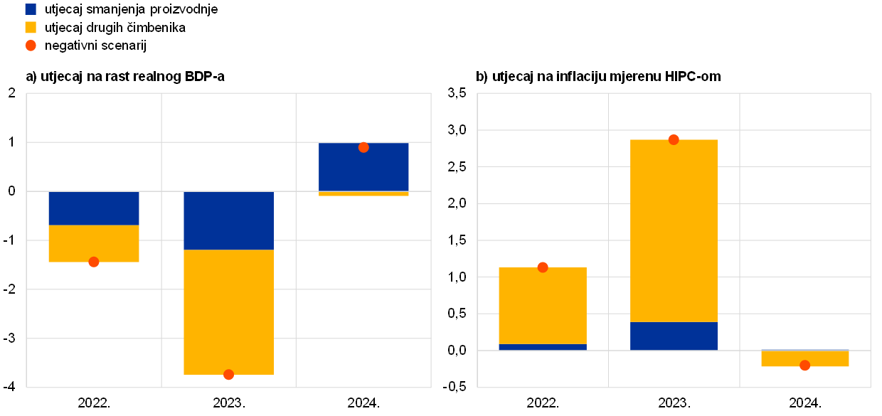 S obzirom na veliku neizvjesnost povezanu s budućim kretanjima, projekcije se dopunjuju negativnim scenarijem kojim se uzima u obzir mogućnost ozbiljnih poremećaja u europskoj opskrbi energijom, što bi dovelo do daljnjih skokova cijena energije i smanjenja proizvodnje. U tom je scenariju stopa inflacije u prosjeku 8,0 % u 2022. i 6,4 % u 2023. te u 2024. pada na 1,9 %, što je manje od osnovne projekcije. Takvo je kretanje u skladu sa snažnim rastom cijena sirovina do kraja 2022. i njihovim znatnim smanjenjem u sljedećem razdoblju. U tom scenariju realni BDP raste za samo 1,3 % u 2022. i smanjuje se za 1,7 % u 2023. Premda se oporavlja u 2024., kada raste za 3 %, i dalje je znatno ispod razine iz osnovnog scenarija tijekom cijelog projekcijskog razdoblja. Ovo izvješće sadržava i analize osjetljivosti povezane s ključnim elementima negativnog scenarija i s učinkom veće indeksacije plaća i alternativnih kretanja cijena energije na osnovne projekcije.