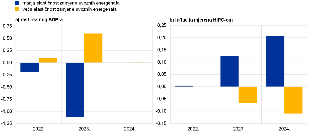 Elastičnost zamjene u vezi sa smanjenjem proizvodnje u negativnom scenariju dobivena je uporabom pristupa zasnovanog na proizvodnoj funkciji CES prema Bachmann, R., Baqaee, D., Bayer, C., Kuhn, M., Löschel, A., Moll, B., Peichl, A., Pittel, K. i Schularick, M. (2022.), What If? The Economic Effects for Germany of a Stop of Energy Imports from Russia, ECONtribute Policy Brief, br. 28/2022., prošireno u Borin, A., Conteduca, P. O., Di Stefano, E., Mancini, M., Gunnella, V. i Panon, L. (2022., objava slijedi). Ta se elastičnost odnosi na mogućnost zamjene uvoznih energenata domaćim izvorima energije ili, općenitije, na stupanj u kojem su gospodarski subjekti spremni preusmjeriti potrošnju s uvoznih energenata na druge proizvode. Pretpostavlja se da je elastičnost na razini europodručja oko 0,04. Kako bi se procijenila osjetljivost kretanja realnog BDP‑a i povezanog odgovora inflacije na različite razine zamjenjivosti, elastičnost je promijenjena za +/– 0,1 a učinak te promjene na makroekonomske varijable dobiven je uporabom modela ECB‑BASE pod pretpostavkom istog omjera šokova potražnje i ponude na kojem se zasniva negativni scenarij. Za model ECB‑BASE vidi Angelini, E., Bokan, N., Christoffel, K., Ciccarelli, M. i Zimic, S., Introducing ECB-BASE: The blueprint of the new ECB semi‑structural model for the euro area, Serija istraživačkih radova ESB‑a, br. 2315., rujan 2019.