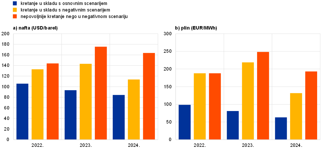 U scenariju se pretpostavlja potpun prekid izvoza ruskih energenata u europodručje od trećeg tromjesečja 2022., što će dovesti do racioniranja opskrbe plinom, znatno viših cijena sirovina, smanjenja trgovinskih aktivnosti i većih problema povezanih s globalnim lancima vrijednosti. I cijene nafte i cijene plina znatno su više nego u osnovnom scenariju. S obzirom na malu mogućnost brze zamjene ruskog plina, pretpostavlja se da će se do četvrtog tromjesečja 2022. cijene plina u Europi udvostručiti u odnosu na osnovni scenarij. I cijene nafte više su nego u osnovnom scenariju – čak do 65 % – premda se pretpostavlja da će države europodručja pronaći alternativne izvore opskrbe naftom na globalnom tržištu. Iako se očekuje da će se na tržištu energenata u srednjoročnom razdoblju postupno ponovno uspostaviti ravnoteža, cijene se zadržavaju na višim razinama nego u osnovnom scenariju: cijene plina i dalje su za gotovo 110 % više nego u osnovnom scenariju za 2024. a cijene nafte za gotovo su 35 % više nego u osnovnom scenariju. Povećanje troškova energije i cijena gnojiva te smanjenje izvoza žitarica iz Rusije i Ukrajine također pridonose porastu globalnih cijena hrane, pri čemu je njihova najviša razina gotovo 30 % iznad razina predviđenih osnovnim scenarijem. Poremećaji opskrbe energijom i mala mogućnost brze zamjene ruskog plina vjerojatno će zahtijevati određeno racioniranje i preraspodjelu resursa, što će prouzročiti smanjenje proizvodnje u europodručju, osobito u energetski intenzivnim sektorima. Poremećaji u globalnim opskrbnim lancima u kratkoročnom će razdoblju postati akutniji, ali će se smanjiti do kraja 2023. Kada je riječ o ruskom gospodarstvu, u scenariju se predviđa teška recesija sa smanjenjem proizvodnje sličnim onom u doba raspada Sovjetskog Saveza.
