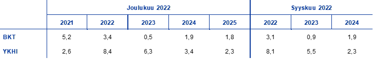 Syyskuun 2022 asiantuntija-arvioihin verrattuna BKT:n kasvu on nyt arvioitu 0,3 prosenttiyksikköä nopeammaksi vuonna 2022 ja 0,4 prosenttiyksikköä hitaammaksi vuonna 2023. Arvio vuodelle 2024 on entisellään. Talouskehitys piristyi vuoden 2022 toisella ja kolmannella vuosineljänneksellä odotettua enemmän, kun pandemiaan liittyvistä rajoituksista päästiin. Vuoden viimeisellä neljänneksellä kehitys jäi energiakriisin ja nopean inflaation myötä odotettua hitaammaksi, kun kuluttajien ja yritysten luottamus tulevaisuuteen heikkeni epävarmassa tilanteessa. Myös kehitys vuonna 2023 on siksi arvioitu heikommaksi kuin syyskuisissa arvioissa, vaikka talouden arvioidaan edelleen hieman piristyvän toiselta vuosineljännekseltä alkaen. Piristyminenkin on heikompaa kuin syyskuisissa arvioissa, joten vuoden 2024 kasvuarvio on entisenlainen vertailuvuoden vaimeasta kehityksestä huolimatta.