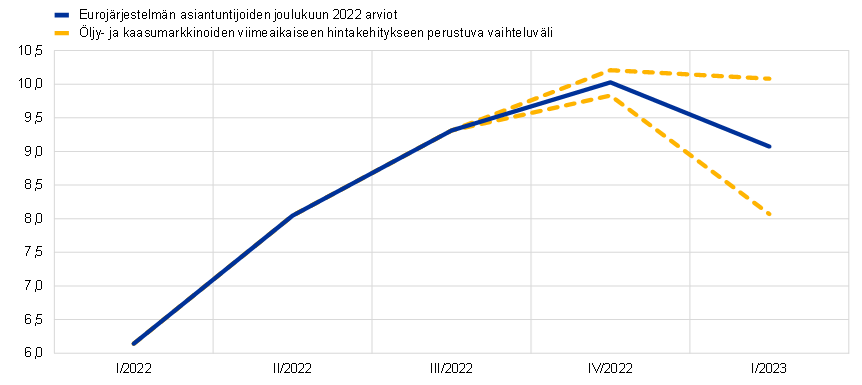 Inflaatio on ollut jatkuvasti nopeampaa kuin syyskuisissa arvioissa ennakoitiin, ja hintakehitys on nopeaa kaikissa YKHIn erissä, vaikka kaasun ja sähkön tukkuhinnat ovat jo laskeneet, kysyntä heikkenee, toimitushäiriöt ovat vähentyneet ja valtiot ovat pyrkineet hillitsemään energian kallistumisen vaikutusta erilaisilla tukitoimilla. Lyhyellä aikavälillä inflaation odotetaan pysyvän erittäin nopeana, sillä esimerkiksi raaka-aineiden kallistumisen, euron valuuttakurssin heikkenemisen, toimitushäiriöiden ja työmarkkinatilanteen vaikutus näkyy kuluttajahinnoissa vasta vähitellen. Inflaation odotetaan silti hidastuvan ensi vuoden kuluessa. Arvioiden mukaan inflaatiovauhti on ollut tämän vuoden viimeisellä neljänneksellä 10 %, mutta ensi vuoden viimeisellä neljänneksellä sen ennakoidaan olevan enää 3,6 %. Keskimääräinen vuotuinen inflaatiovauhti on arvioissa 8,4 % vuonna 2022 ja 6,3 % vuonna 2023, enää 3,4 % vuonna 2024 ja vain 2,3 % vuonna 2025. Vuoden 2023 inflaatiolukemiin vaikuttaa vertailuajankohdan vaikutus. EKP:n rahapolitiikka on tiukentunut vuoden 2021 joulukuun jälkeen, mikä sekin hidastaa vähitellen inflaatiota arviointijaksolla. Lisäksi talouskehitys heikkenee, energian ja elintarvikeraaka-aineiden hintojen oletetaan laskevan futuurihintojen mukaisesti, ja pitkän aikavälin inflaatio-odotusten oletetaan pysyvän EKP:n tavoitteen mukaisina. Inflaatiovauhdin odotetaan asettuvan keskipitkän aikavälin tavoitteen mukaisesti kahteen prosenttiin vuoden 2025 jälkipuoliskolla. Ilman elintarvikkeiden ja energian hintoja laskettu inflaatio on kuitenkin koko arviointijakson ajan yli 2 %, sillä energian kallistumisen vaikutus näkyy hinnoittelussa viiveellä. Lisäksi euron valuuttakurssi on heikentynyt (paitsi aivan viime aikoina), työmarkkinatilanne on vankka, ja inflaation nopeuduttua nimellispalkkojen odotetaan nousevan selvästi tavallista nopeammin. Reaalipalkat pysyvät kuitenkin koko arviointijakson ajan pienempinä kuin ennen sodan puhkeamista Ukrainassa. Inflaatiokehitys on nyt arvioitu huomattavasti nopeammaksi kuin syyskuisissa asiantuntija-arvioissa, sillä inflaatio on viime aikoina ollut ennakoitua nopeampaa, aiemman kehityksen vaikutus näkyy kuluttajahinnoissa yhä vahvemmin, palkkakehitys voimistuu ja elintarvikeraaka-aineiden hinnat ovat nousseet. Vuoden 2022 inflaatioarviossa eroa syyskuiseen on 0,3 prosenttiyksikköä, vuoden 2023 arviossa 0,8 prosenttiyksikköä ja vuoden 2024 arviossa 1,1 prosenttiyksikköä. Nykyisissä arvioissa öljyn, kaasun ja sähkön hinnat on kuitenkin oletettu alemmiksi ja toimitushäiriöiden oletetaan väistyvän nopeammin. Inflaatiokehitystä jarruttavat myös euron viimeaikainen vahvistuminen ja talouskehityksen vaimeneminen. Vuoden 2023 inflaatiovauhti olisi vielä nopeampi ilman syyskuisten arvioiden jälkeen päätettyjä finanssipoliittisia toimia, joiden tarkoituksena on pääasiassa hillitä energian hinnannousua vuonna 2023. Vuoden 2024 inflaatiovauhti on kuitenkin niiden poistumisen myötä tuntuvasti nopeampi.