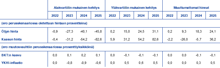 Vaihtoehtoisen hintakehityksen vaikutusta on kartoitettu samoilla malleilla, joita muutenkin käytetään eurojärjestelmän ja EKP:n asiantuntijoiden arvioissa. Alla olevassa taulukossa on esitetty vaihtoehtoisen hintakehityksen vaikutus BKT:n ja inflaation kehitykseen eri malleilla saatujen tulosten keskiarvona. Vuosina 2023–2025 YKHI-inflaatio voisi olla 0,5–0,6 prosenttiyksikköä nopeampaa kuin perusskenaariossa, jos öljyn ja kaasun hinnat kehittyisivät jakaumansa yläkvartiilin mukaisesti. Inflaatiokehitys nopeutuisi arviointijakson lopulla perusskenaarioon verrattuna myös, jos öljyn ja kaasun hinnat pysyisivät muuttumattomina. Jos ne kuitenkin kehittyisivät jakaumansa alakvartiilin mukaisesti, YKHI-inflaatio voisi jäädä 0,8–0,9 prosenttiyksikköä hitaammaksi kuin perusskenaariossa vuosina 2023–2024 ja 0,6 prosenttiyksikköä hitaammaksi vuonna 2025. Yläkvartiilien mukainen tai muuttumaton hintakehitys jarruttaisi BKT:n kasvua 0,1 prosenttiyksikköä vuosina 2024 ja 2025, mutta alakvartiilien mukainen hintakehitys nopeuttaisi sitä 0,2 prosenttiyksikköä vuonna 2024 ja 0,1 prosenttiyksikköä vuonna 2025.