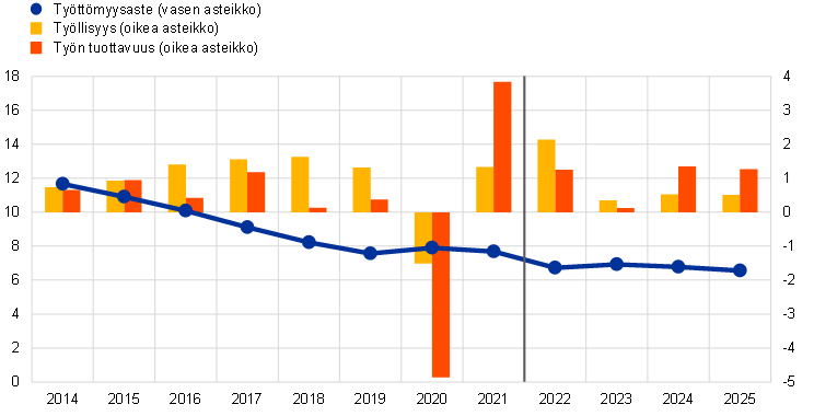 Työmarkkinatilanteen arvioidaan pysyvän vankkana lyhyellä aikavälillä, ja myöhempinä vuosina se kehittyy jokseenkin talouskehityksen mukaisesti (ks. kuvio 4). Työllisyys kasvoi vahvasti vuonna 2022, mutta ensi vuonna kehityksen arvioidaan heikkenevän merkittävästi, sillä vaimean talouskehityksen vuoksi työvoimaa tarvitaan vähemmän. Lyhyellä aikavälillä yritykset todennäköisesti pitävät kiinni työntekijöistään ja pyrkivät säästämään lyhentämällä työaikaa, sillä monille aloille on vaikea löytää uutta työvoimaa. Vuodesta 2024 työllisyyden kehityksen ennakoidaan piristyvän taloudellisen toiminnan lisääntyessä. Vuonna 2022 työn tuottavuus työntekijää kohden laskettuna kohenee arvion mukaan 1,3 %, mutta vuonna 2023 sen odotetaan kasvavan vain 0,1 %. Arviointijakson jälkipuoliskolla kasvuvauhdin arvioidaan olevan 1,4 % vuonna 2024 ja 1,3 % vuonna 2025. Työttömyysasteen arvioidaan nousevan ja olevan ensi vuonna 6,9 %. Vuonna 2025 työttömyysaste on arvioiden mukaan 6,6 %.