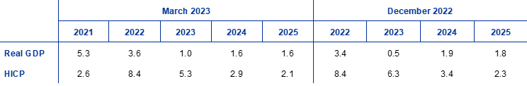 The cut-off date for technical assumptions, such as those for oil prices and exchange rates, was 15 February 2023. The projections for the global economy were finalised on 16 February and the macroeconomic projections for the euro area were finalised on 1 March 2023. Historical data for the euro area also include Croatia for all variables except the Harmonised Index of Consumer Prices (HICP). The current projection exercise covers the period 2023-25. Projections over such a long horizon are subject to very high uncertainty, and this should be borne in mind when interpreting them. See the article entitled “The performance of the Eurosystem/ECB staff macroeconomic projections since the financial crisis”, Economic Bulletin, Issue 8, ECB, 2019. See also http://www.ecb.europa.eu/pub/projections/html/index.en.html for an accessible version of the data underlying selected tables and charts. A full database of past ECB and Eurosystem staff macroeconomic projections is available at https://sdw.ecb.europa.eu/browseSelection.do?node=5275746.