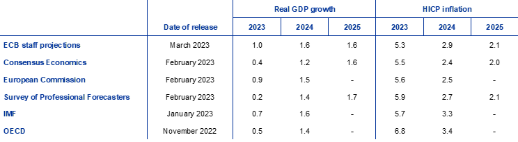 The March 2023 ECB staff projection for GDP growth is above or at the upper end of the range of other forecasts for 2023-24 but within the range for 2025, while the projection for HICP inflation is below the range of other forecasts for 2023 but within the range thereafter. The ECB staff GDP growth projection is marginally above the range of other forecasts for 2023. For 2024, the ECB staff projection is in line with the IMF projection but somewhat above other forecasts, especially the Consensus Economics forecast, while for 2025 it is similar to other forecasts. As regards HICP inflation, the ECB staff projection is below all other forecasts for 2023, most likely as it takes account of the most recent declines in energy prices. For the remainder of the horizon, it is within the range of other forecasts.
