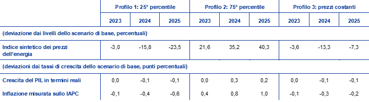 Data la considerevole incertezza riguardo agli andamenti futuri dei prezzi dell’energia, per valutare le implicazioni per le prospettive riguardanti l’inflazione misurata sullo IAPC e la crescita del PIL in termini reali sono stati calcolati profili alternativi per i prezzi dell’energia utilizzando i prezzi del petrolio e del gas impliciti nelle opzioni e un’ipotesi di prezzi costanti. In questa analisi di sensibilità viene usato un indice sintetico dei prezzi dei prodotti energetici che combina i prezzi dei contratti future sia sul petrolio sia sul gas. Un profilo alternativo al ribasso e uno al rialzo sono stati calcolati con il 25° e il 75° percentile delle densità delle probabilità neutrali al rischio implicite nelle opzioni per il prezzo sia del petrolio sia del gas al 23 maggio 2023 (la data di ultimazione delle ipotesi tecniche). Entrambe le distribuzioni indicano rischi al rialzo per le ipotesi tecniche incorporate nelle proiezioni di giugno 2023, che sono particolarmente pronunciati per le quotazioni dei contratti future sul gas. Inoltre, si considera un’ipotesi di prezzi costanti sia per il petrolio sia per il gas. Gli effetti dei profili alternativi sono valutati sulla base di una serie di modelli macroeconomici degli esperti della BCE e dell’Eurosistema utilizzati per le proiezioni. Gli effetti medi sulla crescita del PIL in termini reali e sull’inflazione risultanti da tali modelli sono riportati nella tavola seguente.