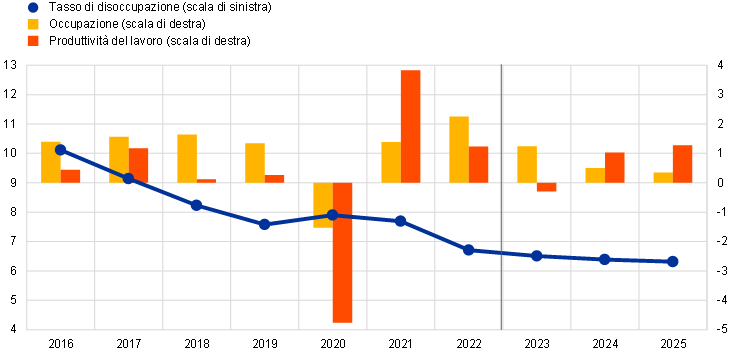 Il mercato del lavoro dovrebbe rimanere robusto e caratterizzato da condizioni tese nel periodo considerato (grafico 3). L’occupazione è aumentata notevolmente nel primo trimestre del 2023, salendo dello 0,6% rispetto al trimestre precedente, nonostante la lieve flessione del PIL in termini reali. Tale aumento va ricondotto principalmente alla forte espansione delle forze di lavoro. La crescita dell’occupazione sarebbe pari all’1,3% nel 2023, ma diminuirebbe nel resto dell’orizzonte temporale di riferimento raggiungendo lo 0,4% nel 2025. Il tasso di disoccupazione dovrebbe scendere ulteriormente da un livello già storicamente basso e collocarsi al 6,3% nel 2025. Le ore medie lavorate per addetto registrerebbero un aumento ulteriore nel periodo in rassegna, in contrasto con il calo tendenziale negli anni antecedenti la pandemia, ma si ritiene che rimangano comunque inferiori al livello pre-crisi nel quarto trimestre del 2025. La crescita della produttività, che si è ridotta nettamente negli ultimi trimestri ed è diminuita dello 0,6% nel primo trimestre del 2023, raggiungerebbe il punto di minimo quest’anno per poi salire su livelli superiori alla media storica nel 2024 e nel 2025.