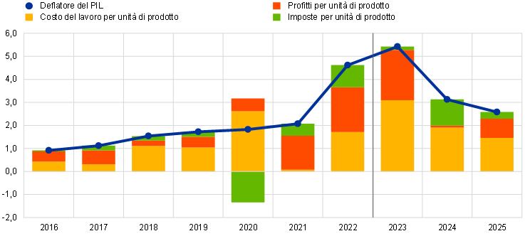 Per maggiori informazioni in merito alla scomposizione del deflatore del PIL e al ruolo dei profitti per unità di prodotto ai fini dell’analisi dell’inflazione, cfr. Arce, O., Hahn, E. e Koester, G., “How tit-for-tat inflation can make everyone poorer”, Il Blog della BCE, 30 marzo 2023, oltre che i riquadri di E. Hahn “La relazione tra profitti e pressioni interne sui prezzi nell’area dell’euro”, Bollettino economico, numero 6, BCE, 2019, e “Il ruolo dei margini di profitto nell’adeguamento allo shock da COVID-19”, Bollettino economico, numero 2, BCE, 2021.