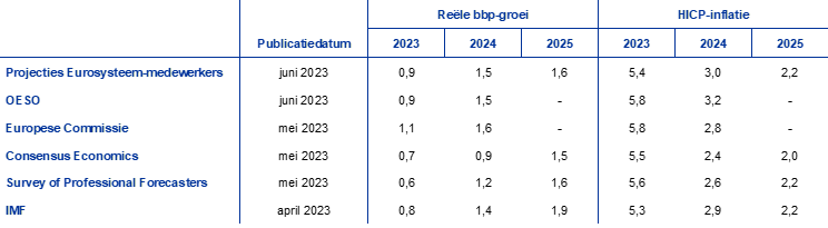 De door medewerkers van het Eurosysteem samengestelde projecties van juni 2023 liggen binnen de bandbreedte van de andere prognoses voor de bbp-groei en de inflatie. De projectie van medewerkers van het Eurosysteem voor de bbp-groei is in overeenstemming met de prognose van de OESO en ligt iets onder de prognose van de Europese Commissie, maar hoger dan de prognose van het IMF en de prognoses van de private sector in 2023-2024. Wat de HICP-inflatie betreft, behoort de door medewerkers van het Eurosysteem opgestelde projectie voor 2024 tot de hoogste prognoses, maar deze ligt 0,2 procentpunt onder de prognose van de OESO. Voor 2025 ligt de HICP-inflatie rond de bovengrens van de nauwe bandbreedte van andere prognoses, maar deze is wel in overeenstemming met de prognoses van het IMF en de Survey of Professional Forecasters.