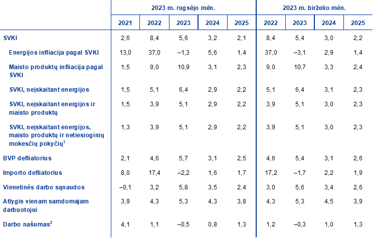 Palyginti su 2023 m. birželio mėn. prognozėmis, infliacijos pagal SVKI 2023 ir 2024 m. prognozė padidinta 0,2 procentinio punkto, o 2025 m. prognozė sumažinta 0,1 procentinio punkto. Dėl pastaruoju metu gautų netikėtų duomenų, didesnių naftos ateities sandorių kainų ir reguliuojamų kainų pokyčių energijos sudedamosios dalies 2023 ir 2024 m. prognozė padidinta. Padidintą prognozę iš dalies atsvėrė tai, kad ne energetikos sudedamųjų dalių prognozės buvo sumažintos. Maisto produktų kainų kilimo 2023 m. prognozė buvo padidinta daugiausia dėl netikėtai didesnių rodiklių, o 2024 ir 2025 m. prognozė sumažinta dėl prastesnių techninių prielaidų dėl supirkimo kainų euro zonoje. Infliacijos pagal SVKI, neįskaitant energijos ir maisto produktų, 2023 m. prognozė nepakeista, tačiau 2024 ir 2025 m. prognozė sumažinta dėl sustiprėjusio euro kurso ir prognozuojamos mažesnės paklausos.