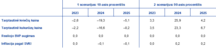 Panaši jautrumo analizė atliekama taikant alternatyvius tarptautinių maisto produktų kainų raidos scenarijus, pagal kuriuos numatomas aukštesnis šių kainų lygis. Šioje analizėje daroma prielaida, kad tarptautinės kviečių ir kukurūzų žaliavų kainos atitinka pagal pasirinkimo sandorius išvestų kainų, fiksuotų rugpjūčio 22 d., 10-ąjį ir 90-ąjį procentilius. Pasiskirstymas pagal scenarijus rodo, kad esama didesnės rizikos, susijusios su prielaidomis. Taip yra, tikėtina, dėl su klimato kaita susijusios rizikos, „El Niño“ reiškinio, kuris gali sustiprinti jau ir taip dėl klimato kaitos galimai didesnį ekstremalių meteorologinių reiškinių dažnį, ir tebesitęsiančio neapibrėžtumo dėl pasaulinių grūdų atsargų vykstant karui Ukrainoje. Alternatyvių scenarijų poveikis infliacijos euro zonoje prognozėms vertinamas pagal elastingumą iš Eurosistemos ekspertų makroekonominių modelių, naudojamų rengiant prognozes, ir parodytas toliau pateiktoje lentelėje. Šių pakilusių maisto kainų poveikis euro zonos realiojo BVP augimui būtų nedidelis.