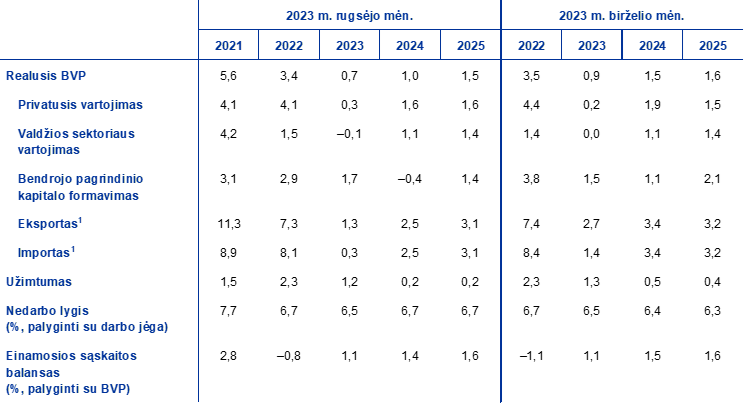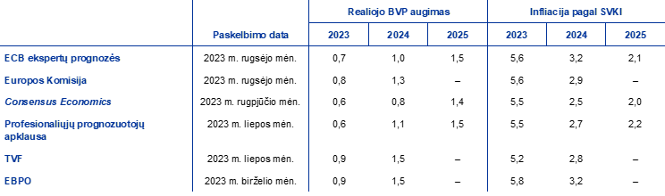Šaltiniai: Europos Komisijos 2023 m. vasaros (tarpinė) ekonominė prognozė, 2023 m. rugsėjo 11 d.; Consensus Economics prognozės, 2023 m. rugpjūčio 10 d. (2025 m. duomenys – iš 2023 m. liepos mėn. apklausos); ECB profesionaliųjų prognozuotojų apklausa, 2023 m. liepos 28 d.; TVF pasaulio ekonomikos perspektyvos vertinimas, 2023 m. liepos 25 d.; 2023 m. birželio mėn. EBPO ekonomikos perspektyvos vertinimas Nr. 113, 2023 m. birželio 7 d.
