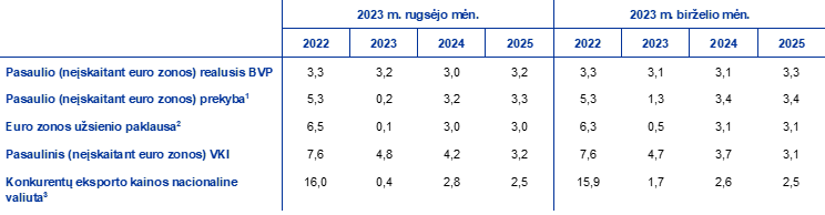 Pasaulinė bendroji infliacija mažėja, tačiau grynąją infliaciją didinantys veiksniai vis dar stiprūs, ypač išsivysčiusios ekonomikos šalyse, o euro zonos konkurentų eksporto kainos turėtų labai sumažėti dėl žaliavų kainų raidos. Numatoma, kad pasaulinė bendroji infliacija pagal vartotojų kainų indeksą šiais metais bus 4,8 %, o 2024 ir 2025 m. pamažu sumažės iki atitinkamai 4,2 % ir 3,2 %. Palyginti su birželio mėn. prognozėmis, pasaulinės infliacijos šių metų prognozė iš esmės nepakeista, tačiau 2024 m. prognozė šiek tiek padidinta. Tai daugiausia susiję su padidinta numatoma infliacija Turkijoje ir mažiau linkusia kisti infliacija Jungtinėje Karalystėje, nes kelis kartus buvo gauti netikėtai didesni rodikliai, susiję su vartotojų kainų kilimu ir darbo užmokesčiu. Euro zonos konkurentų eksporto kainos (nacionaline valiuta) nuo 2022 m. vidurio mažėja dėl mažėjančių žaliavų kainų ir nuosekliai slopstančio vidaus ir užsienio kainų spaudimo vėlyvesniuose gamybos etapuose. Euro zonos konkurentų eksporto kainų šių metų prognozė, palyginti su birželio mėn. prognozėmis, sumažinta dėl mažesnio pagrindinių prekybos partnerių eksporto kainų kilimo, o 2024 m. prognozė šiek tiek padidinta dėl pakilusių žaliavų kainų.