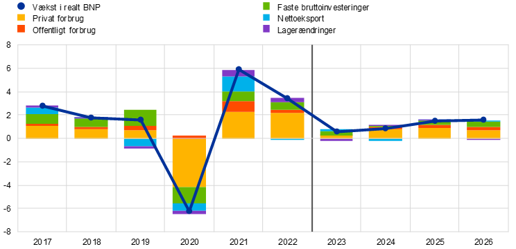 Anm.: De historiske data kan afvige fra Eurostats seneste publikationer (se også fodnote 2). Den lodrette linje angiver starten på den aktuelle fremskrivningsperiode. Intervallerne omkring de centrale fremskrivninger giver et mål for graden af usikkerhed og er symmetriske. De er baseret på tidligere fremskrivningsfejl efter korrektion for ekstreme værdier. Intervallerne viser – fra mørkest til lysest – sandsynligheden på 30 pct., 60 pct. og 90 pct. for, at resultatet af væksten i realt BNP falder inden for de respektive intervaller. Yderligere oplysninger findes i Boks 6 i ECB's stabs makroøkonomiske marts 2023-fremskrivninger.