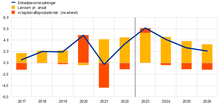 Inflationen er fortsat med at falde som følge af aftagende energiinflation, effekten af den pengepolitiske stramning og den igangværende lempelse af pres på forsyningskæden og forsyningsflaskehalse. Efter at være faldet til 2,4 pct. i november 2023 forventes HICP-inflationen midlertidigt at stige på kort sigt som følge af en fornyet stigning i energiinflationen. Den underliggende inflationsdæmpende proces forventes dog at fortsætte trods kraftige stigninger i arbejdsomkostningerne, som i stigende grad er den dominerende drivkraft for HICP-inflationen ekskl. energi og fødevarer. Trods en vis afkøling forventes arbejdsmarkedet fortsat at være stramt. Sammen med kompensationseffekterne af den tidligere høje inflation bør dette holde den nominelle lønvækst på et højt niveau. Lønvæksten forventes dog at aftage i fremskrivningsperioden, efterhånden som den opadrettede effekt af inflationskompensation gradvis lempes. Overskuddet steg markant i 2022, men forventes at blive svækket i løbet af fremskrivningsperioden og at udgøre en stødpude for arbejdsomkostningernes gennemslag. Givet at inflationsforventningerne på mellemlangt sigt vurderes at forblive forankrede på ECB's 2 pct.-inflationsmål, forventes den samlede HICP-inflation overordnet set at falde fra 5,4 pct. i 2023 til gennemsnitligt 2,7 pct. i 2024, 2,1 pct. i 2025 og 1,9 pct. i 2026. Sammenlignet med fremskrivningerne fra september 2023 er HICP-inflationen blevet nedjusteret for 2023 og 2024, hovedsagelig på grund af lavere nye tal end forventet og lavere antagelser om råvarepriserne på energi, hvorimod den er uændret for 2025.