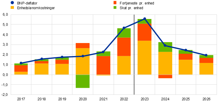 8. Yderligere oplysninger om dekomponeringen af BNP-deflatoren og den rolle, som fortjeneste pr. enhed spiller i forbindelse med inflationsanalyser, findes i boksen af E. Hahn med titlen "How have unit profits contributed to the recent strengthening of euro area domestic price pressures?", Economic Bulletin, 4. udgave, ECB, 2023, samt O. Arce, E. Hahn og G. Koester, "How tit-for-tat inflation can make everyone poorer", ECB's blog, 30. marts 2023.
