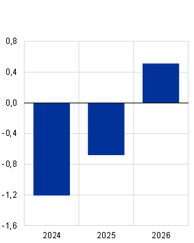Euroområdets økonomi svækkedes i 2. halvår 2023 som følge af strammere finansieringsforhold, afdæmpet tillid og tab af konkurrenceevne. Den forventes nu at rette sig i et lidt langsommere tempo, end det fremgik af ECB's stabs makroøkonomiske fremskrivninger fra september 2023. Kortsigtede indikatorer tyder på en svag økonomisk aktivitet i 4. kvartal 2023. Væksten forventes dog at blive styrket fra begyndelsen af 2024, i takt med at den disponible realindkomst stiger – understøttet af faldende inflation, robust lønvækst og robust beskæftigelse – og eksportvæksten indhenter den forbedrede udenlandske efterspørgsel. Virkningen af ECB's pengepolitiske stramning og ugunstige kreditudbudsforhold slår fortsat igennem i økonomien og påvirker dermed vækstudsigterne på kort sigt. Disse afdæmpende effekter forventes at aftage senere i fremskrivningsperioden, hvilket vil understøtte væksten. Samlet set forventes den gennemsnitlige årlige vækst i realt BNP at aftage fra 3,4 pct. i 2022 til 0,6 pct. i 2023, inden den igen stiger til 0,8 pct. i 2024 og stabiliserer sig på 1,5 pct. i 2025 og 2026. Sammenlignet med fremskrivningerne fra september 2023 er udsigterne for BNP-væksten blevet nedjusteret en smule for 2023-2024 på baggrund af de seneste data og svage konjunkturbarometre, hvorimod de er uændrede for 2025[1].