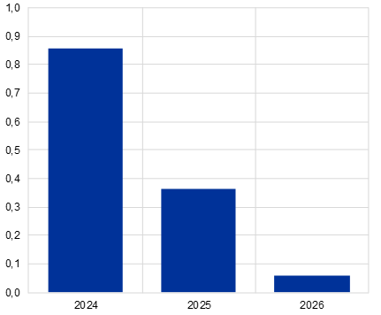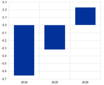 På mellemlangt sigt ventes BNP-væksten at stabilisere sig på et niveau, der stort set svarer til gennemsnittet før pandemien, understøttet af stigende realindkomster og en styrket udenlandsk efterspørgsel. Væksten i realt BNP forventes at blive styrket i 2024-2025 og at stabilisere sig i 2026 (tabel 2). Selvom den seneste medvind er ved at aftage, forventes væksten at blive drevet af et aftagende inflationspres, som understøttes af afviklingen af energistødet samt en robust indkomstvækst. Disse faktorer kan give et kraftigt opsving i det private forbrug på baggrund af robuste arbejdsmarkeder. Ikke desto mindre vil tilbagetrækningen af de finanspolitiske støtteforanstaltninger på energi- og inflationsområdet, der er indført siden 2022, have en lille negativ indvirkning på væksten i 2024-26.