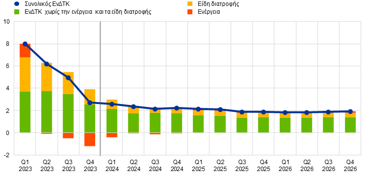 Ο πληθωρισμός αναμένεται, βάσει των προβολών, να αποκλιμακωθεί περαιτέρω λόγω της συνεχιζόμενης άμβλυνσης των πιέσεων σε προηγούμενα στάδια της αλυσίδας διαμόρφωσης των τιμών και λόγω της επίδρασης που ασκεί η περιοριστική νομισματική πολιτική, αν και με βραδύτερο ρυθμό από ό,τι είχε παρατηρηθεί το 2023. Οι πιέσεις αυτές αναμένεται να συνεχίσουν να εξασθενούν και οι διαταράξεις στις θαλάσσιες μεταφορές στην Ερυθρά Θάλασσα αναμένεται να έχουν περιορισμένη ανοδική επίδραση. Καθώς οι τιμές της ενέργειας μειώνονται, οι έντονες εξελίξεις στο κόστος εργασίας αναμένεται να αποτελέσουν τον κυρίαρχο παράγοντα που συμβάλλει στον πληθωρισμό βάσει του Εναρμονισμένου Δείκτη Τιμών Καταναλωτή (ΕνΔΤΚ) χωρίς τις τιμές της ενέργειας και των ειδών διατροφής. Ο ρυθμός αύξησης των ονομαστικών μισθών αναμένεται να παραμείνει υψηλός, λόγω της επίμονης στενότητας στην αγορά εργασίας, αλλά να υποχωρήσει σταδιακά στη διάρκεια του χρονικού ορίζοντα προβολής καθώς θα εξασθενεί η ανοδική επίδραση των μέτρων αντιστάθμισης του πληθωρισμού. Η ανάκαμψη του ρυθμού αύξησης της παραγωγικότητας αναμένεται να συμβάλει στη συγκράτηση των πιέσεων από την πλευρά του κόστους εργασίας. Η αύξηση των κερδών εκτιμάται ότι θα επιβραδυνθεί στη διάρκεια του χρονικού ορίζοντα προβολής και θα απορροφήσει μέρος του κόστους εργασίας, περιορίζοντας τη μετακύλισή του στις τιμές. Συνολικά, ο μέσος ετήσιος γενικός πληθωρισμός (βάσει του ΕνΔΤΚ) αναμένεται να μειωθεί από 5,4% το 2023 σε 2,3% το 2024, 2,0% το 2025 και 1,9% το 2026. Δεδομένων των υποτονικών προοπτικών για τον πληθωρισμό των τιμών της ενέργειας, ο γενικός πληθωρισμός αναμένεται να παραμείνει χαμηλότερος του πληθωρισμού (βάσει του ΕνΔΤΚ) χωρίς την ενέργεια και τα είδη διατροφής σε όλη τη διάρκεια του χρονικού ορίζοντα προβολής. Σε σύγκριση με τις προβολές του Δεκεμβρίου 2023, ο πληθωρισμός (βάσει του ΕνΔΤΚ) έχει αναθεωρηθεί προς τα κάτω για το 2024 και το 2025, κυρίως λόγω των άμεσων και έμμεσων επιδράσεων από τις χαμηλότερες υποθέσεις για τις τιμές των ενεργειακών βασικών εμπορευμάτων και τις μικρότερες πιέσεις από την πλευρά του κόστους εργασίας, ενώ για το 2026 παραμένει αμετάβλητος.