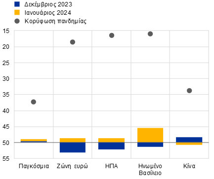 Ο ετήσιος γενικός πληθωρισμός σε παγκόσμιο επίπεδο αναμένεται, βάσει των προβολών, να μειωθεί στη διάρκεια του χρονικού ορίζοντα προβολής, ενώ ο ρυθμός μεταβολής των τιμών των εξαγωγών των ανταγωνιστών της ζώνης του ευρώ αναμένεται να γίνει θετικός εφέτος. Ο παγκόσμιος γενικός πληθωρισμός βάσει του δείκτη τιμών καταναλωτή (ΔΤΚ) διαμορφώθηκε σε 4,9% το 2023 και θα μειωθεί σταδιακά σε 4,1% το 2024, 3,2% το 2025 και 2,8% το 2026. Ενώ η αποκλιμάκωση του πληθωρισμού προς τον στόχο των κεντρικών τραπεζών αναμένεται, βάσει των προβολών, να συντελεστεί σταδιακά στις προηγμένες οικονομίες, ο πληθωρισμός στις αναδυόμενες οικονομίες της αγοράς αναμένεται να επιταχυνθεί ελαφρώς εφέτος και στη συνέχεια να μειωθεί εκ νέου. Η εξέλιξη αυτή αντανακλά την προβλεπόμενη άνοδο του πληθωρισμού σε ορισμένες σημαντικές οικονομίες, όπως η Κίνα, η Ρωσία και η Τουρκία. Οι τιμές των εξαγωγών των ανταγωνιστών της ζώνης του ευρώ (σε εθνικό νόμισμα και σε ετήσια βάση) υποχώρησαν τα τρία τελευταία τρίμηνα του 2023, καθώς οι τιμές των βασικών εμπορευμάτων μειώθηκαν και οι εγχώριες και οι εξωτερικές πιέσεις σε προγενέστερα στάδια της αλυσίδας διαμόρφωσης των τιμών μετριάστηκαν σημαντικά. Καθώς θα εξασθενεί η επίδραση αυτών των παραγόντων, ο ρυθμός μεταβολής των τιμών εξαγωγών των ανταγωνιστών αναμένεται, βάσει των προβολών, να γίνει εκ νέου θετική το 2024. Σε σύγκριση με τις προβολές του Δεκεμβρίου 2023, ο ρυθμός αύξησης των τιμών έχει αναθεωρηθεί ελαφρώς προς τα κάτω για το 2024, εν μέσω χαμηλότερων πιέσεων σε προγενέστερα στάδια της αλυσίδας διαμόρφωσης των τιμών και ελαφρώς χαμηλότερων τιμών των ενεργειακών βασικών εμπορευμάτων.