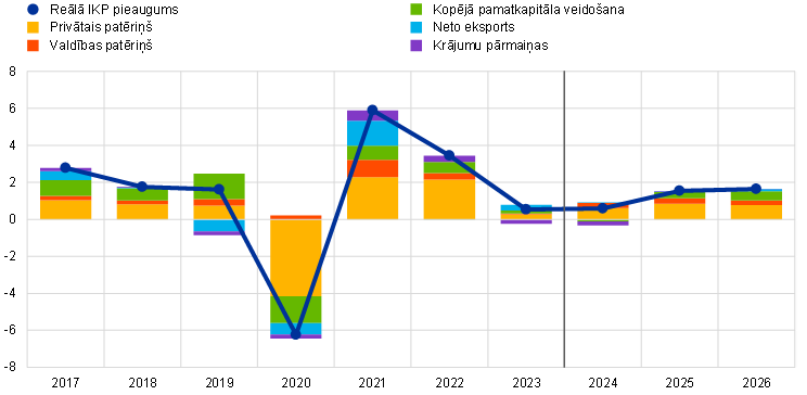 Gaidāms, ka veicinošo faktoru izzušanas un stingro finansēšanas nosacījumu apstākļos reālā IKP pieaugums 2024. gada sākumā joprojām būs ierobežots, bet pēc tam nostiprināsies. To veicinās mājsaimniecību ienākumu kāpums, valdības patēriņš un ārējais pieprasījums. Atbalsts aktivitātei, ko radīja tautsaimniecības atkalatvēršanās pēc pandēmijas, ir izzudis, savukārt stingro finansēšanas nosacījumu un lielās patērētāju nenoteiktības nelabvēlīgā ietekme joprojām ir būtiska. Uz nākotni vērstie apsekojumu rādītāji 2024. gada pirmajos divos mēnešos pamatā joprojām pasliktinās. Tomēr sarūkošajai inflācijai un stabilajam algu kāpumam joprojām ierobežota darbaspēka piedāvājuma kontekstā šā gada 1. pusgadā vajadzētu nostiprināt mājsaimniecību pirktspēju. Tāpēc gaidāms, ka aktivitāti galvenokārt veicinās privātais patēriņš. 2024. gada 2. pusgadā izaugsmei vajadzētu kļūt vēl straujākai. To noteiks privātā patēriņa kāpums reāli rīcībā esošo ienākumu pieauguma un gaidāmās konfidences uzlabošanās apstākļos. Paredzams, ka 2024. gadā pieaugs arī valdības patēriņš, daļēji atspoguļojot novēloto inflācijas kompensācijas ietekmi uz valsts sektorā nodarbināto atalgojumu, savukārt eksportam vajadzētu vēl vairāk izlīdzināties ar ārējo pieprasījumu. Gaidāms, ka vidējā termiņā reālā IKP pieaugums turpinās nostiprināties, nedaudz pārsniedzot vidējo līmeni pirms pandēmijas. To veicinās reālo ienākumu kāpums, ārējā pieprasījuma nostiprināšanās un mazāka monetārās un fiskālās politikas ietekme (2. tabula). Augstās inflācijas un enerģijas cenu kompensācijas nolūkā kopš 2022. gada ieviesto fiskālo atbalsta pasākumu ieviešanai 2024.–2026. gadā būs neliela negatīva ietekme uz izaugsmi, bet vispārējā fiskālā nostāja 2025. un 2026. gadā kopumā būs neitrāla.