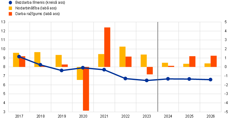 Darba tirgus joprojām ir noturīgs, lai gan tas nedaudz atdziest, nodarbinātības pieaugumam, kā gaidāms, atkal atgūstot līdzsvaru pēc 2023. gadā vērojamā spēcīgā pieauguma. Gaidāms, ka kopējās nodarbinātības pieaugums pamatā atbilstoši 2023. gada decembra iespēju aplēsēm saruks no 1.4 % 2023. gadā līdz 0.5 % 2024. gadā un stabilizēsies, 2025. un 2026. gadā attiecīgi sasniedzot 0.3 % un 0.4 % (3. att.). Iespēju aplēšu periodā gaidāma darba ražīguma pieauguma nostiprināšanās, bet uzskatāms, ka 2026. gadā produktivitātes līmenis saglabāsies ievērojami zemāks par ilgtermiņa lineāro tendenci. Gaidāms, ka bezdarba līmeņa līkni raksturos neliels kuprveida izliekums. Tiek uzskatīts, ka, ar laika nobīdi reaģējot uz vājo ekonomisko aktivitāti, 2024. gadā tā palielināsies līdz 6.7 % un pēc tam 2025. un 2026. gadā samazināsies līdz 6.6 %. Bezdarba līmenis ir koriģēts un palielināts par 0.1 procentu punktu 2024. un 2025. gadā un par 0.2 procentu punktiem 2026. gadā.