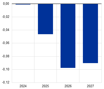 La poursuite du retrait des mesures restantes de soutien en matière d’énergie, globalement inchangées depuis septembre, constitue une autre source de durcissement en 2025. L’assouplissement des facteurs non discrétionnaires, principalement lié à des pertes de recettes et d’autres résidus d’impôts, n’entraîne aucun changement de l’orientation budgétaire en 2025 par rapport aux projections de septembre.