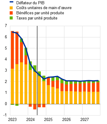 La croissance des coûts unitaires de main-d’œuvre devrait ralentir en 2025 et 2026, en lien notamment avec l’augmentation de la productivité et la moindre hausse des salaires. La croissance des coûts unitaires de main-d’œuvre se serait établie à 4,5 % au troisième trimestre 2024 et devrait diminuer fortement, jusqu’à 2,0 % en moyenne d’ici 2027[20]. Elle resterait néanmoins supérieure à la moyenne de long terme de 1,8 %. Par rapport aux projections de septembre 2024, la progression des coûts unitaires de main-d’œuvre a été revue à la hausse de 0,2 point de pourcentage pour 2024 et à la baisse de 0,1 point de pourcentage pour 2026.
