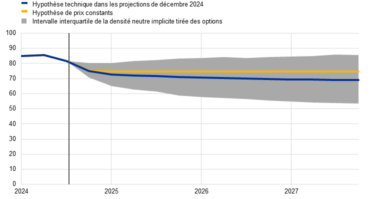Par rapport aux projections de septembre 2024, les principales modifications des hypothèses techniques portent sur une contraction des prix du pétrole et de l’électricité, mais une augmentation des prix du gaz, une dépréciation du taux de change et un recul des taux d’intérêt. Les hypothèses relatives aux prix du pétrole et de l’électricité, fondées sur les prix des contrats à terme, ont été légèrement révisées à la baisse, tandis que celles relatives au gaz ont été relevées pour 2025 et légèrement diminuées pour 2026. Les prix de l’énergie devraient se replier sur l’horizon de projection. Les prix des matières premières hors énergie ont été revus fortement à la hausse pour 2025 et un peu à la baisse pour 2026. L’euro s’est déprécié de 3,0 % par rapport au dollar américain et de 1,3 % en termes effectifs nominaux. Il devrait rester stable sur l’horizon de projection. Sur la base des anticipations des marchés, les hypothèses relatives aux taux d’intérêt à court terme ont été réduites de 20 à 30 points de base pour la période 2025-2026, tandis que celles relatives aux rendements obligataires à long terme ont été légèrement rehaussées.