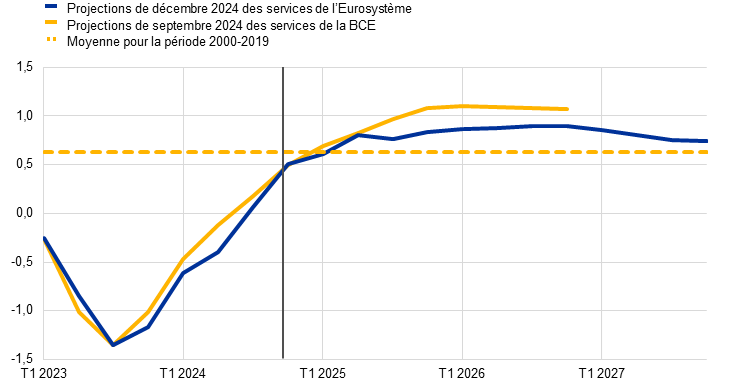 L’économie de la zone euro devrait continuer de se redresser progressivement au cours des prochaines années, dans un contexte de fortes incertitudes géopolitiques et économiques. Bien que la croissance ait repris à un rythme modéré courant 2024, les récents indicateurs pointent un ralentissement à court terme. La faiblesse persistante de la confiance des consommateurs et le niveau élevé des incertitudes devraient inciter les ménages à épargner encore davantage. Les conditions d’un nouveau renforcement de la croissance économique sont néanmoins réunies. La progression des salaires réels et de l’emploi, sur fond de marchés du travail robustes, devrait notamment soutenir la reprise, dont la consommation reste l’un des principaux moteurs. La demande intérieure devrait également être stimulée par un assouplissement des conditions de financement, conformément aux anticipations des marchés relatives à l’évolution future des taux d’intérêt. Quoiqu’’entourées d’une grande incertitude, les politiques budgétaires seraient globalement en voie d’assainissement. Cela étant, les fonds alloués dans le cadre du programme « Next Generation EU » (NGEU) devraient continuer d’alimenter la croissance jusqu’à son expiration en 2027. Dans l’hypothèse de référence de politiques commerciales inchangées des principaux partenaires de l’Europe, la demande extérieure devrait se renforcer et soutenir les exportations de la zone euro. En conséquence, les exportations nettes apporteraient une contribution globalement neutre à la croissance du PIB, malgré les défis actuels en matière de compétitivité. Le taux de chômage devrait continuer de se replier, pour se situer à des niveaux extrêmement bas. Même si les difficultés structurelles persistent, la productivité, qui a récemment baissé sous l’effet de certains facteurs conjoncturels, devrait se redresser sur l’horizon de projection. Globalement, la croissance annuelle moyenne du PIB en volume devrait s’établir à 0,7 % en 2024, 1,1 % en 2025 et 1,4 % en 2026, avant de se modérer à 1,3 % en 2027. Par rapport aux projections macroéconomiques des services de la BCE de septembre 2024, les perspectives de croissance du PIB ont été revues à la baisse, principalement en raison des révisions des données relatives à l’investissement au premier semestre 2024, des anticipations d’un ralentissement de la croissance des exportations en 2025 et d’une légère réduction de la projection d’expansion de la demande intérieure en 2026.[1]