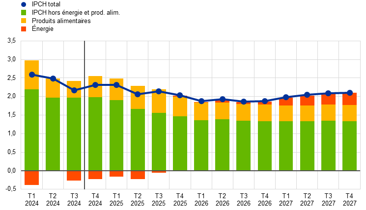 La hausse de l’IPCH global devrait s’accélérer fin 2024, avant de s’estomper et de fluctuer autour de l’objectif d’inflation de 2 % de la BCE à partir du deuxième trimestre 2025. Les effets de base de la composante énergie devraient être le principal facteur à l’origine de l’augmentation temporaire de l’inflation au début de l’horizon de projection. Sur la base d’hypothèses de recul des prix du pétrole et du gaz, les prix de l’énergie devraient continuer de diminuer jusqu’au second semestre 2025 et évoluer modérément par la suite, à l’exception d’une accélération en 2027 due à l’introduction de nouvelles mesures d’atténuation du changement climatique. La hausse des prix des produits alimentaires devrait s’accentuer jusque mi-2025, principalement sous l’effet d’un rebond des prix des produits alimentaires non transformés, avant de retomber à une moyenne de 2,2 % d’ici 2027. L’augmentation de l’IPCH hors énergie et produits alimentaires (IPCHX) devrait ralentir début 2025 en raison de l’affaiblissement des effets indirects des chocs antérieurs sur les prix de l’énergie, de la modération des tensions sur les coûts de main-d’œuvre et de la transmission continue, avec un décalage, du resserrement passé de la politique monétaire sur les prix à la consommation. Ce ralentissement serait principalement dû à une plus faible hausse des prix des services, relativement persistante jusqu’à présent. De manière générale, l’inflation mesurée par l’IPCHX devrait revenir de 2,9 % en 2024 à 1,9 % en 2027. La croissance des salaires demeurera élevée dans un premier temps, avant de ralentir progressivement avec l’allégement des mesures de compensation prises face à l’inflation. La décélération de la croissance de la rémunération par tête, conjuguée à une reprise de la croissance de la productivité, devrait entraîner une progression beaucoup plus lente des coûts unitaires de main-d’œuvre. En conséquence, les tensions d’origine interne sur les prix devraient s’atténuer, les marges bénéficiaires amortissant dans un premier temps les tensions toujours fortes sur les coûts de main-d’œuvre, mais se rétablissant sur l’horizon de projection. Les tensions sur les prix d’origine externe resteraient globalement modérées. Par rapport aux projections de septembre 2024, les perspectives de hausse de l’IPCH global ont été légèrement révisées à la baisse pour 2024 et 2025, principalement en raison de la détérioration inattendue de certaines données et des hypothèses de recul des prix du pétrole et de l’électricité.