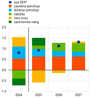 Viri: OECD Economic Outlook, 3. junij 2025; pomladanska gospodarska napoved Evropske komisije 2025, 19. maj 2025; napovedi Consensus Economics, 12. maj 2025 (podatki za leto 2027 so iz ankete iz januarja 2025); anketa o napovedih drugih strokovnjakov (Survey of Professional Forecasters), 22. april 2025; Mednarodni denarni sklad (MDS), World Economic Outlook, 22. april 2025.