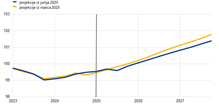 Medtem ko bo skupna inflacija, merjena s harmoniziranim indeksom cen življenjskih potrebščin (HICP), v bližnji prihodnosti najverjetneje ostala pod 2%, se bo srednjeročno po pričakovanjih vrnila na ciljno raven. Inflacija se bo tekom leta 2025 po projekcijah zniževala in bo v prvem četrtletju 2026 dosegla najnižjo raven (1,4%), nato pa se bo leta 2027 vrnila na 2,0%. K znižanju skupne inflacije v letu 2025 naj bi deloma prispevala negativna inflacija v skupini energentov, potem ko so se nedavno znižale cene nafte in veleprodajne cene zemeljskega plina. Inflacija v skupini energentov bo predvidoma ostala negativna do leta 2027, ko bodo začeli veljati novi ukrepi za blažitev podnebnih sprememb v okviru novega sistema za trgovanje z emisijami (ETS2). Po začasnem zvišanju v drugem četrtletju 2025 bo inflacija v skupini hrane v letu 2027 po pričakovanjih upadla na raven rahlo nad 2%. Inflacija brez energentov in hrane se bo predvidoma znižala, k čemur bo prispevala skupina storitev, ker se učinki zapoznelih prilagoditev cen pri nekaterih postavkah umirjajo, plačni pritiski zmanjšujejo in nižje cene energentov prelivajo vzdolž cenovne verige. Rast plač naj bi se še naprej zniževala, ker popuščajo pritiski, da se nadoknadi preteklo zmanjšanje realnih plač. To bo skupaj z okrevanjem rasti produktivnosti predvidoma privedlo do precej počasnejše rasti stroškov dela na enoto proizvoda. Zunanji cenovni pritiski, kot se odražajo v uvoznih cenah, bodo po pričakovanjih ostali umirjeni ob predpostavki, da bodo carinske politike EU ostale nespremenjene, pri čemer določen pritisk na znižanje izhaja iz močnejšega eura in znižanja cen energetskih surovin v zadnjih mesecih. V primerjavi z marčnimi projekcijami je napovedana skupna inflacija za leti 2025 in 2026 popravljena za 0,3 odstotne točke navzdol zaradi predpostavk o nižjih cenah energetskih surovin in apreciacije eura, medtem ko za leto 2027 ostaja nespremenjena.