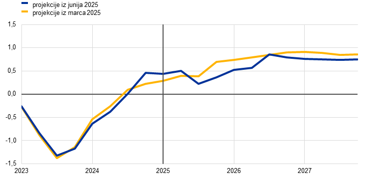 Obeti za gospodarsko rast v euroobmočju so oslabljeni zaradi trgovinskih napetosti in povečane negotovosti na svetovni ravni. Te učinke naj bi v letu 2025 kot celoti deloma odtehtala močnejša gospodarska aktivnost od pričakovane v prvem četrtletju, ki najverjetneje delno odraža hitenje z izvozom v pričakovanju višjih carin. Srednjeročno naj bi gospodarsko aktivnost podpirali pred kratkim napovedani novi javnofinančni ukrepi. V osnovnih projekcijah se predpostavlja, da bodo ameriške carine na proizvode EU, ki so se zvišale na 10%, še naprej veljale v celotnem obdobju projekcij. Višje carine bodo skupaj s povečano negotovostjo glede trgovinskih politik in nedavno apreciacijo eura zavirale izvoz in naložbe ter v manjši meri potrošnjo v euroobmočju. Nasprotno naj bi nova državna potrošnja za infrastrukturo in obrambo, predvsem v Nemčiji, od leta 2026 spodbujala domače povpraševanje v euroobmočju. Na splošno so še vedno izpolnjeni pogoji za krepitev rasti BDP v euroobmočju v obdobju projekcij. Tako naj bi k postopnemu okrevanju prispevali zviševanje realnih plač in zaposlenosti, manj strogi pogoji financiranja – predvsem zaradi nedavnih sklepov o denarni politiki – in odboj zunanjega povpraševanja proti koncu obdobja projekcij. Povprečna letna realna rast BDP bo predvidoma znašala 0,9% v letu 2025, 1,1% v letu 2026 in 1,3% v letu 2027. V primerjavi z letošnjimi marčnimi makroekonomskimi projekcijami strokovnjakov ECB obeti za rast BDP za leto 2025 ostajajo nespremenjeni zaradi najnovejših podatkov, ki so boljši od pričakovanih, vendar naj bi to večinoma izravnali učinki trgovinskih napetosti in apreciacije tečaja eura. Zaradi trgovinskih napetosti in močnejšega deviznega tečaja je bila rast za leto 2026 popravljena navzdol, za leto 2027 pa je ostala nespremenjena.[1]