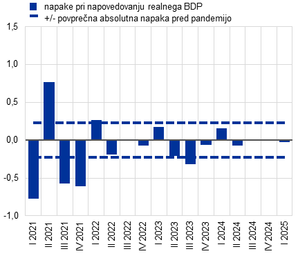 Opombe: Napake so opredeljene kot dejanska vrednost za dano četrtletje minus projekcija, ki je bila pripravljena štiri četrtletja prej (npr. takrat objavljen podatek za zadnje četrtletje 2022 minus projekcija, ki so jo strokovnjaki Eurosistema pripravili decembra 2021).
