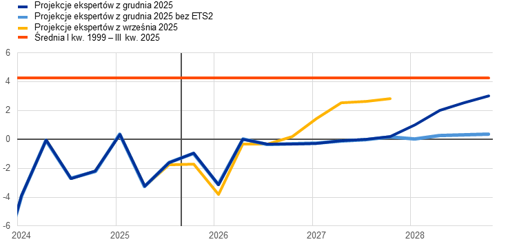 Wpływ nowego systemu ETS2 na stopę inflacji HICP w 2028 wynosi 0,2 pkt proc. Jednak z powodu zaokrągleń projekcja inflacji HICP jest tylko o 0,1 pkt proc. wyższa od stopy z wyłączeniem ETS2.