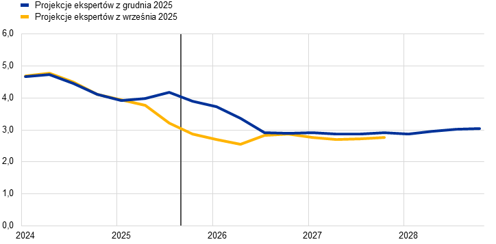 Inflacja według projekcji spadnie z 2,1% w 2025 do 1,9% w 2026, a następnie do 1,8% w 2027, po czym w 2028 wzrośnie do poziomu średniookresowego celu EBC wynoszącego 2%. Oczekiwany spadek inflacji ogółem (mierzonej zharmonizowanym wskaźnikiem cen konsumpcyjnych – HICP) na początku 2026 jest odzwierciedleniem ujemnego efektu bazy wynikającego z cen energii, podczas gdy inflacja składowych nieenergetycznych powinna dalej słabnąć przez cały 2026. Według przewidywań kontrybucja inflacji cen energii do inflacji ogółem pozostanie niewielka aż do ostatnich miesięcy 2027, po czym wyraźnie zwiększy się w 2028 w związku z oczekiwanym wdrożeniem unijnego systemu handlu uprawnieniami do emisji 2 (ETS2), którego wzrostowe oddziaływanie na inflację ogółem wyniesie 0,2 pkt proc. Oczekuje się, że inflacja HICP z wyłączeniem cen energii spadnie z 2,5% w 2025 do 2,2% w 2026 i 2,0% w latach 2027 i 2028. Inflacja cen żywności według projekcji znacznie się obniży w miarę słabnięcia wpływu wcześniejszego wzrostu cen surowców żywnościowych na świecie i niekorzystnych warunków pogodowych w okresie letnim, a od końca 2026 ustabilizuje się na poziomie nieco powyżej 2%. Inflacja HICP z wyłączeniem cen energii i żywności (HICPX) ma się zmniejszać – z 2,4% w 2025 do 2,0% w 2028 – w miarę jak inflacja cen usług będzie słabnąć przy ustępowaniu presji związanej z kosztami pracy, a wcześniejsza aprecjacja euro oddziaływać w łańcuchu cenowym i ograniczać inflację cen towarów. Dynamika płac powinna nadal się obniżać w 2026, a następnie ustabilizować się na poziomie około 3%, czemu sprzyjać będzie odporność rynku pracy i wzrost produktywności wynoszący nieco poniżej 1%. Dynamika jednostkowych kosztów pracy według oczekiwań będzie się obniżać, choć odnośny wpływ na inflację ma być częściowo równoważony przez stopniowy wzrost marż zysku w horyzoncie projekcji. W porównaniu z projekcjami z września 2025 perspektywy inflacji HICP ogółem na 2026 zrewidowano w górę o 0,2 pkt proc., co wynika z niedawnych zaskakujących danych dotyczących inflacji HICP i wzrostu płac. Dane o dynamice płac doprowadziły do znacznej rewizji w górę perspektyw płac. Projekcja inflacji HICP na 2027 została zrewidowana nieco w dół ze względu na zakładaną niższą kontrybucję inflacji cen energii (jako że wdrożenie systemu ETS2 ma zostać przełożone z 2027 na 2028), choć tę kontrybucję powinna częściowo zrównoważyć wyższa inflacja cen usług.