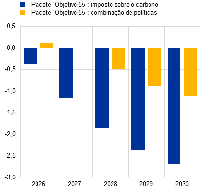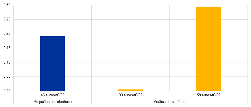 O impacto do CELE 2 na taxa de inflação medida pelo IHPC em 2028 ascende a 0,2 pontos percentuais. No entanto, a projeção para a inflação medida pelo IHPC situa‑se apenas 0,1 pontos percentuais acima da taxa excluindo o CELE 2, devido a efeitos de arredondamento.