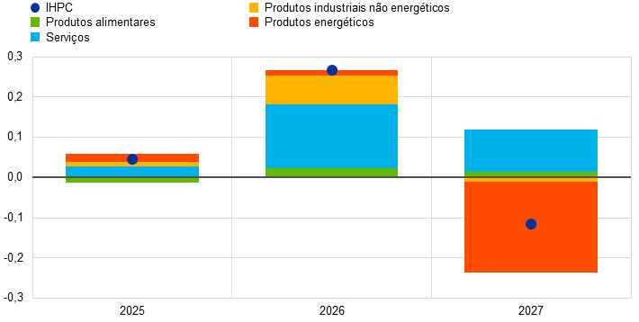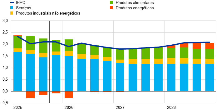 De acordo com as projeções, a inflação descerá de 2,1% em 2025 para 1,9% em 2026 e 1,8% em 2027, subindo em 2028 para o objetivo de médio prazo de 2% definido pelo BCE. A esperada descida da inflação global – medida pelo Índice Harmonizado de Preços no Consumidor (IHPC) – no início de 2026 reflete um efeito de base em sentido descendente decorrente dos preços dos produtos energéticos, ao passo que a inflação das componentes não energéticas deverá continuar a abrandar ao longo de 2026. O contributo da inflação dos preços dos produtos energéticos para a inflação global deverá permanecer reduzido até finais de 2027 e aumentar significativamente em 2028, impulsionado pela prevista implementação do novo sistema de comércio de licenças de emissão da União Europeia (UE) – referido como “Comércio Europeu de Licenças de Emissão 2” ou “CELE 2” –, tendo um impacto em sentido ascendente de 0,2 pontos percentuais na inflação global. A inflação medida pelo IHPC excluindo produtos energéticos deverá descer de 2,5% em 2025 para 2,2% em 2026 e 2,0% em 2027 e 2028. Projeta‑se que a inflação dos preços dos produtos alimentares registe uma queda considerável, com o desvanecimento dos efeitos de anteriores subidas dos preços mundiais das matérias‑primas alimentares e das condições meteorológicas adversas durante o verão, devendo estabilizar em taxas um pouco superiores a 2% a partir de finais de 2026. Segundo as projeções, a inflação medida pelo IHPC excluindo produtos energéticos e produtos alimentares (IHPCX) registará uma moderação de 2,4% em 2025 para 2,0% em 2028, com a descida da inflação dos preços dos serviços, devido ao abrandamento das pressões sobre os custos do trabalho, e a transmissão gradual da anterior apreciação do euro ao longo da cadeia de preços, reduzindo a inflação dos preços dos bens. O crescimento dos salários deverá continuar a moderar‑se em 2026, estabilizando depois em cerca de 3%, apoiado por um mercado de trabalho resiliente e um crescimento da produtividade apenas ligeiramente inferior a 1%. O crescimento dos custos unitários do trabalho deverá abrandar, embora se considere que o impacto na inflação será parcialmente compensado por uma recuperação gradual das margens de lucro durante o horizonte de projeção. Em comparação com as projeções de setembro de 2025, as perspetivas para a inflação global medida pelo IHPC foram revistas em sentido ascendente em 0,2 pontos percentuais para 2026, espelhando surpresas recentes em termos de dados relativos à inflação medida pelo IHPC e ao crescimento salarial, o que, neste último caso, levou a uma considerável revisão em alta das perspetivas salariais. A projeção para a inflação medida pelo IHPC foi objeto de uma ligeira revisão em baixa para 2027, em resultado do pressuposto menor contributo da inflação dos preços dos produtos energéticos, em virtude de se prever agora que a implementação do CELE 2 seja adiada de 2027 para 2028, apesar de se considerar que este contributo seja parcialmente compensado por uma inflação dos preços dos serviços mais forte.